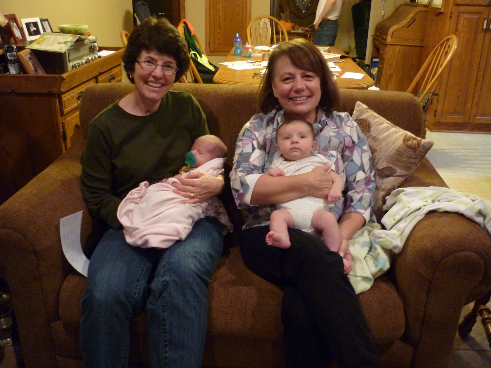 Grandma and Grandma holding their newest grandkids, Grey and Leila.